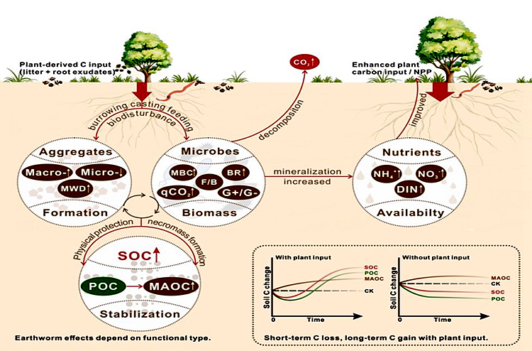 蚯蚓在全球碳循环中扮演着双重角色,它们既能加速有机质分解,又能促进土壤有机碳(SOC)的固存。然而,关于蚯蚓同时影响SOC矿化与稳定性的机制仍不确定。研究验证了三个假设:一是持续的植物源碳输入使蚯蚓能够同时促进微生物呼吸和土壤有机碳的储存,这一过程主要通过增加矿物结合态有机碳(MAOC)和土壤团聚体形成;二是这一稳定效应受蚯蚓功能型的调控:其中内栖型蚯蚓主要促进MAOC形成与团聚体稳定,而表栖型蚯蚓则更显著影响有机质的分解;三是蚯蚓对SOC的影响程度受蚯蚓来源、生态系统类型与气候条件等因素的系统性调控,其中植物持续输入、微生物-矿物相互作用条件适宜的环境中,蚯蚓的碳稳定化效应更强。通过系统验证这些假设,本研究明确了蚯蚓在全球土壤碳循环中的核心作用,强调需将蚯蚓功能性状、碳输入动态纳入地球系统模型和气候智慧型土地管理策略中,这对推动基于自然的气候解决方案具有重要意义。