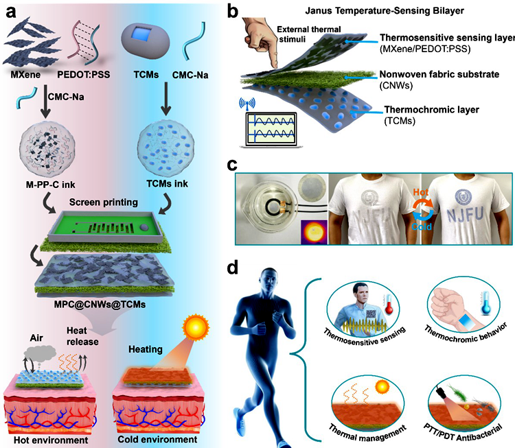 近年来,随着可穿戴健康监测与个体防护需求的快速增长,传统纺织材料在温度感知与功能集成方面仍存在不足。针对这一问题,taptap官网科研团队提出基于纤维素非织造材料的Janus双层结构,在材料两侧分别构建MXene/PEDOT:PSS热敏导电层与热致变色微胶囊层,实现电学与光学信号协同输出。研究表明,该材料可在20-75 ℃范围内实现高灵敏温度监测(0.018 ℃-1),并通过颜色变化实现直观可视反馈;同时,依托MXene的光热效应,在近红外照射下可实现快速升温并达到>99.99%的抗菌性能,兼具温度监测、热管理与生物防护功能。进一步研究发现,Janus结构通过空间分离与机制互补,有效提升了信号稳定性与抗干扰能力,在湿度、汗液及外界压力等复杂条件下仍能保持可靠响应。材料同时具备良好的透气性与柔性,并表现出优异的耐久性。总之,该研究实现了多功能集成,为智能可穿戴纺织品及健康防护材料的发展提供了新的思路。