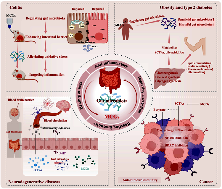 该综述还总结了近年来MCGs在疾病干预中的应用潜力,涉及炎症性肠病、代谢综合征、神经退行性疾病及肿瘤等领域。另外,随着纳米技术与糖工程的发展,基于甘露糖修饰的靶向递送系统不断涌现(如纳米颗粒、脂质体及多糖基载体等),可实现对肠道炎症部位或特定受体的精准递送,显著提升活性物质的稳定性与生物利用度。同时,该综述还强调了溶酶体靶向降解技术(如LYTACs)在该领域的前沿应用。本文不仅深化了对天然甘露糖类物质调控肠道健康机制的认知,也为功能食品开发、靶向递送体系构建及微生态干预策略提供了重要参考,具有显著的科学意义与应用价值。