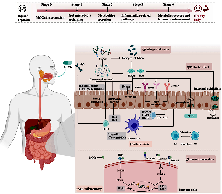 该研究系统梳理了天然含甘露糖聚合物(MCGs)结构多样性与生物功能间的内在联系,重点阐述其益生元效应、免疫调节作用及肠道屏障保护功能,进一步探讨了其与肠道微生物的相互作用及生物活性代谢物的生成过程,为基于MCGs开发调节肠道健康的功能性食品或营养保健品奠定了理论基础。MCGs作为一类典型的微生物可利用碳源,可选择性促进有益菌生长、抑制致病菌定植,进而重塑肠道微生态结构。MCGs通过与肠道微生物的复杂互作,诱导生成短链脂肪酸、吲哚类代谢物及胆汁酸衍生物等多种生物活性代谢物。此外,其特征性甘露糖结构可被树突状细胞和巨噬细胞表面的C型凝集素受体特异性识别,进而调控炎症信号通路、促进免疫耐受并维持肠道免疫稳态。