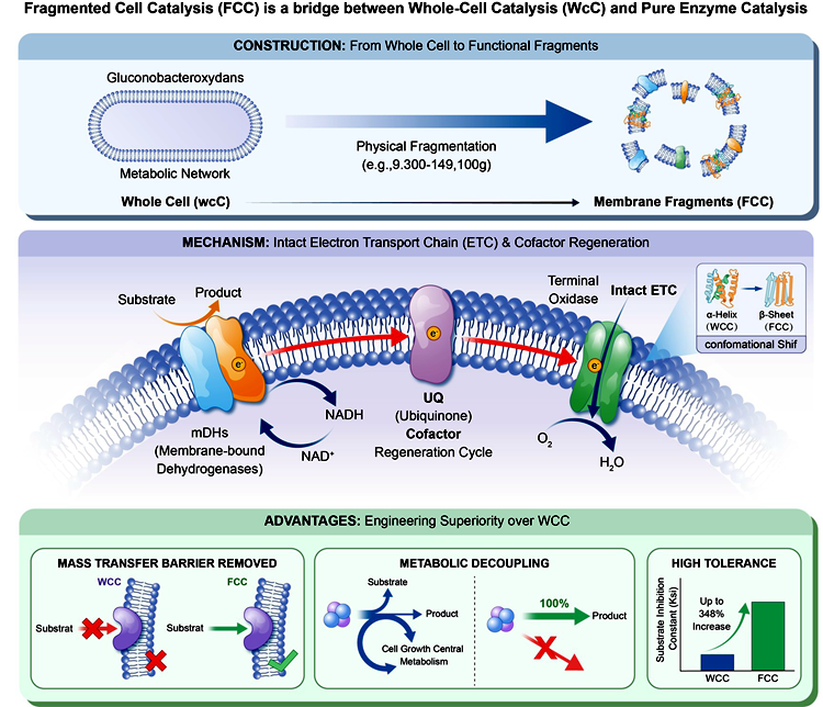 该成果是团队长期聚焦全细胞和亚细胞结构高效生物催化氧化的系列研究成果之一,也是继2022年后在《AIChE Journal》上发表的第二篇相关研究论文(论文链接:https://doi.org/10.1002/aic.18005)。生物催化氧化是生物工程领域的核心平台技术之一,可转化生产多种醛和酸类化学品,广泛应用于食品、医药、能源、材料及环保等领域。其中,氧化葡萄糖酸杆菌(Gluconobacter oxydans)是重要的模式微生物,可定向催化氧化醇羟基和醛基,开展其催化机理与新方法具有重要的科学意义。传统好氧生物必须催化依赖于完整的全细胞结构,存在着细胞分解代谢、跨细胞壁及细胞膜传质屏障、细胞活性依赖等问题。