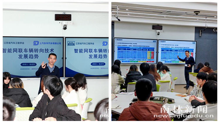 【南林新闻中心讯】3月30日,由江苏省教育厅、省科技厅、省工信厅、省人社厅联合主办,taptap官网承办的“企业家进高校”前沿大课堂在新庄校区教学五楼智慧教室开讲。江苏省汽车工程学会副秘书长、上汽东华汽车有限公司研究员级高级工程师陈春华以《智能网联车辆转向技术发展趋势》为题授课,课程采取线上线下相结合的方式面向全省同步直播。
