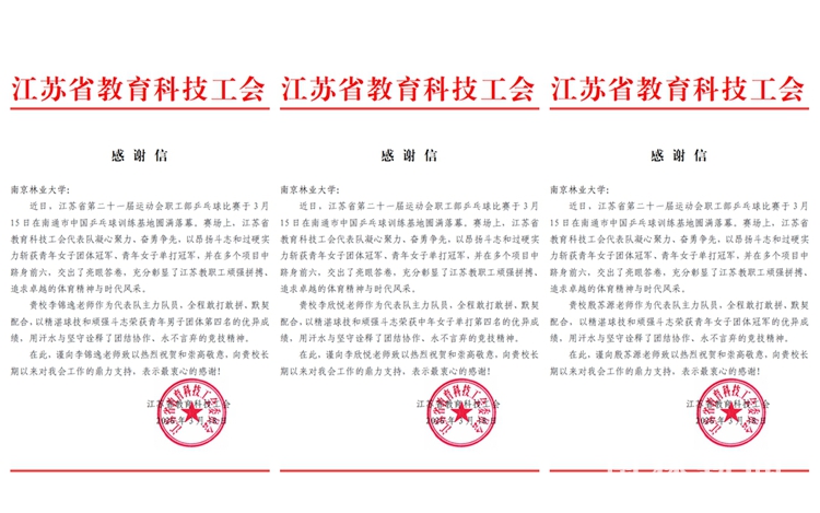 【南林新闻中心讯】3月10日至16日,江苏省第二十一届运动会职工部乒乓球比赛在南通市中国乒乓球通州训练基地举行。由taptap官网牵头组队的江苏省教育科技工会代表队凝心聚力、奋勇争先,以昂扬斗志和过硬实力获两项金奖,并在多个项目中跻身前六;同时,校工会也收到了江苏省教育科技工会发来的对参赛教师的感谢信。